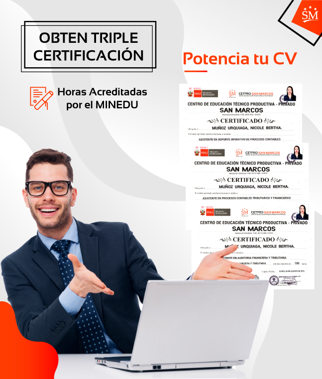 El Centro de Educación Técnico Productiva Privado "San Marcos" (CETPRO SAN MARCOS), otorga al terminar CERTIFICADO A NOMBRE DEL MINISTERIO DE EDUCACIÓN, luego de haber aprobado: